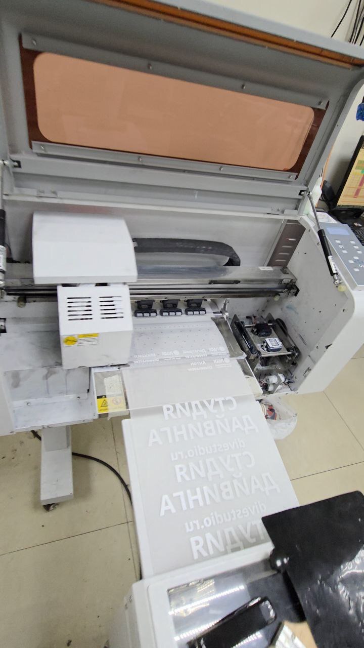 - Изображение наносят на пленку с использованием пигментных чернил. Чернила гарантируют высокую детализацию и насыщенность цветов. Пленка выступает промежуточным носителем перед переносом на ткань.